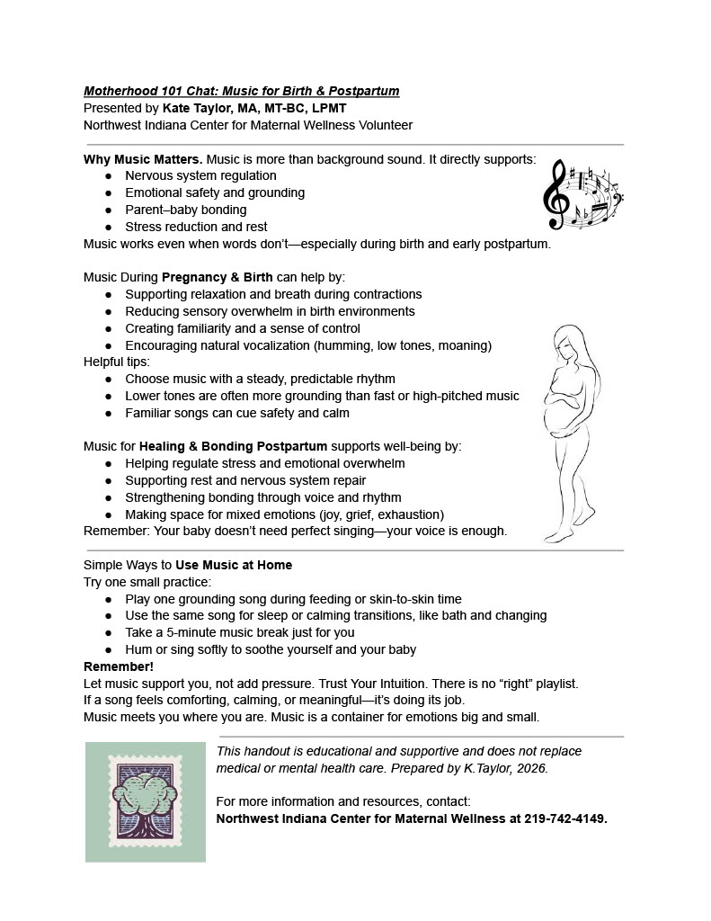 Sometimes, music can also serve as a container to explore feelings. Listening with intention offers moments of pause and reflection or motivation to move depending on what you need. If a song that once felt comforting now feels irritating or overwhelming, or if anxiety and sadness interfere with daily functioning, these are gentle signals that additional support may be needed. At the Northwest Indiana Center for Maternal Wellness, help is available through peer support, individual check-ins, community education, and compassionate listening. Reaching out is a strength, not a weakness.